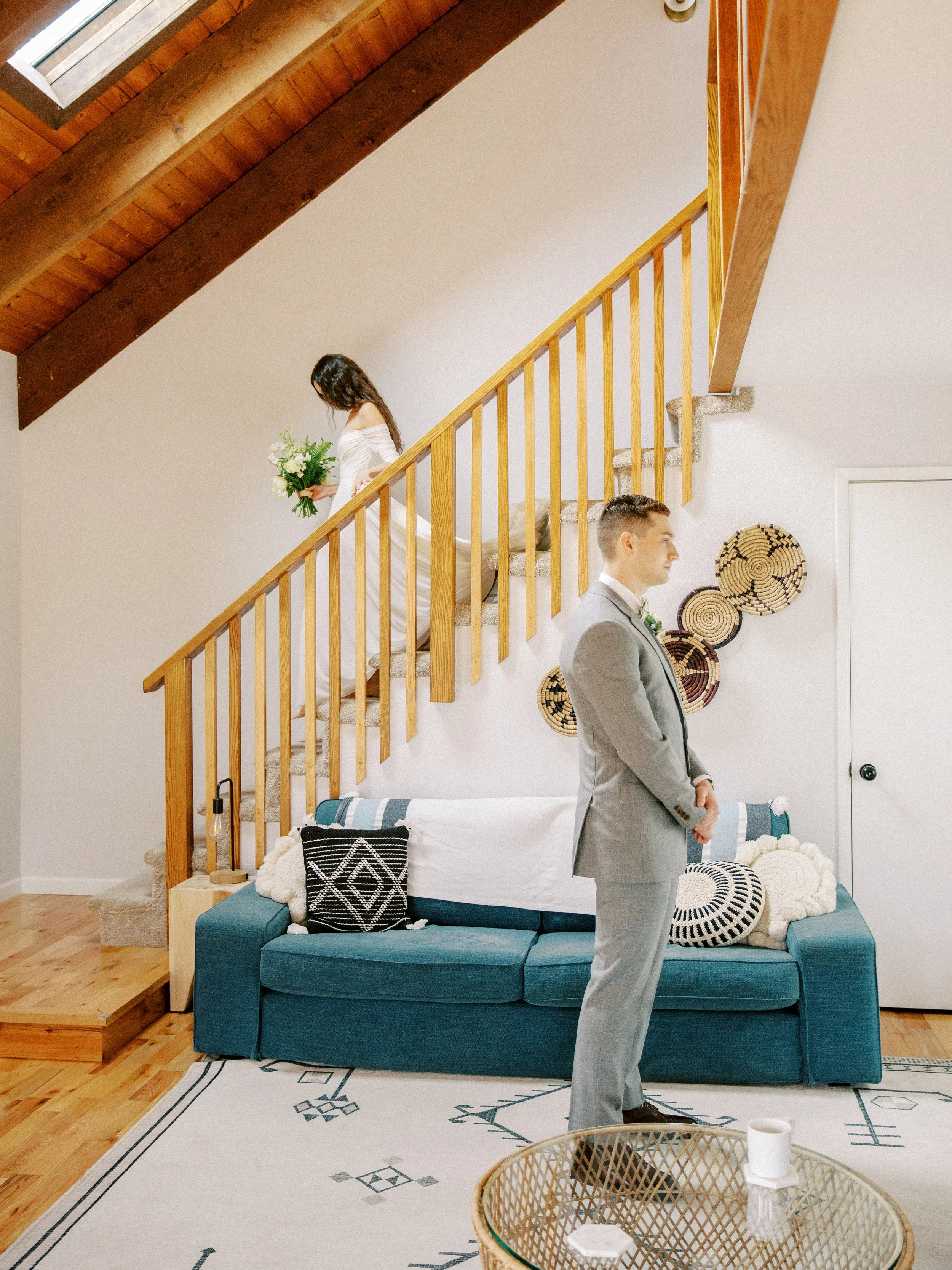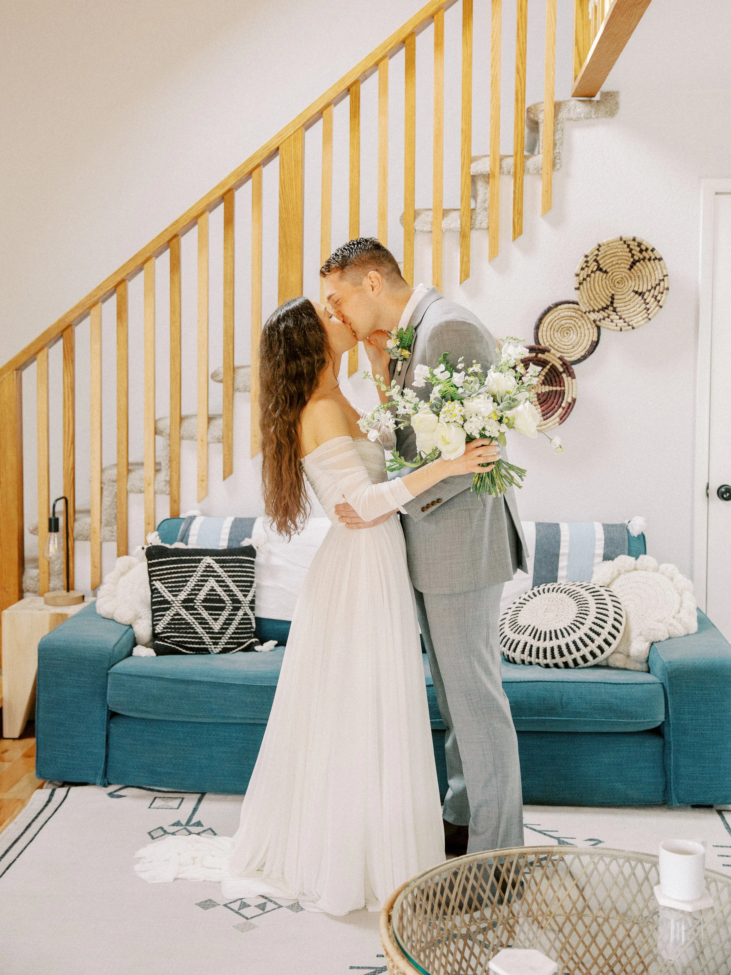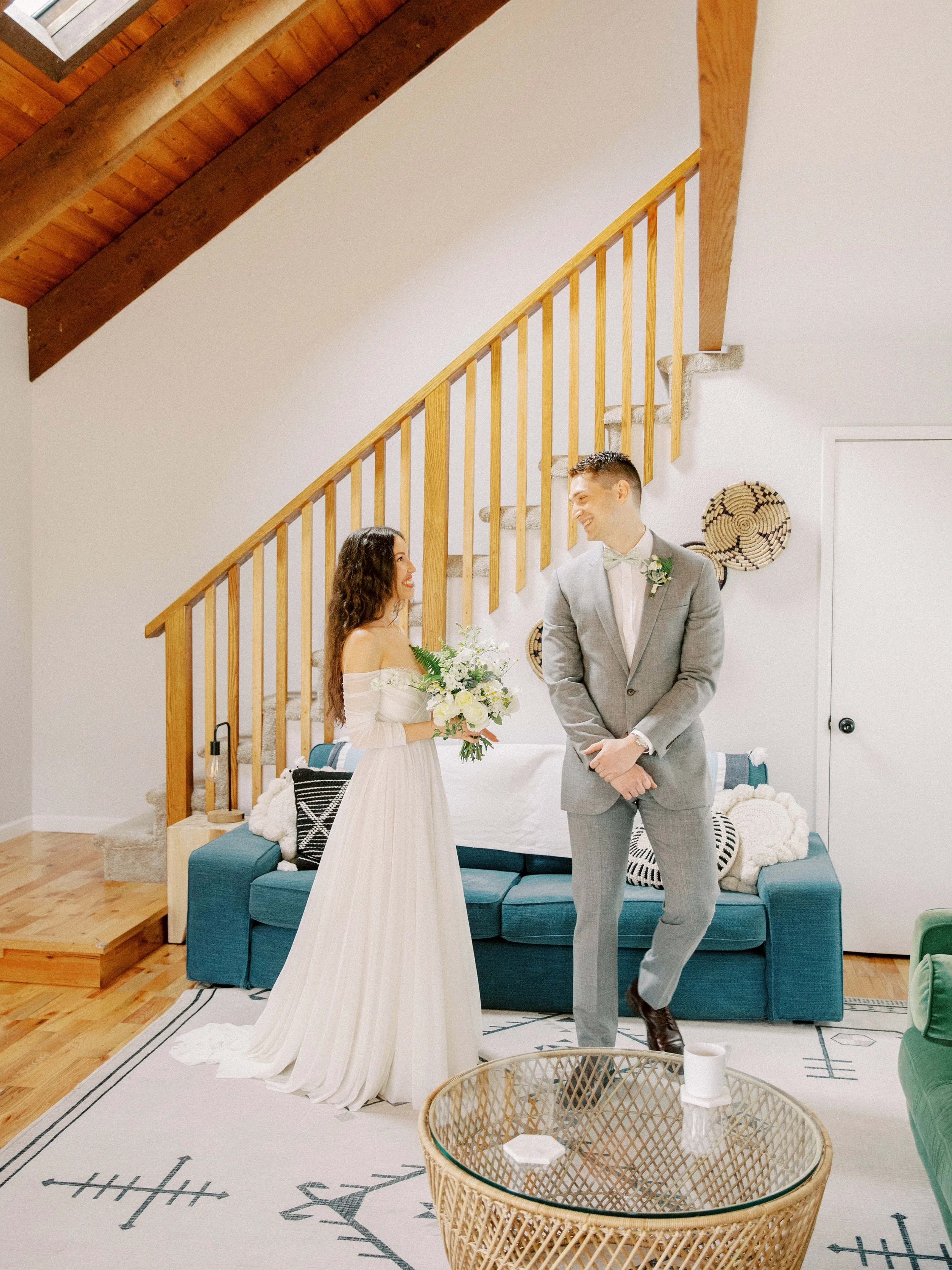 Katy and Nolan had a beautiful elopement wedding day in Brookings, Oregon. The weather was mild with a mixture of the sun peaking through and soft billowy clouds (As can be typical for the Oregon Coast even in the summer!). We started off the day with getting ready in a beautiful private residence airbnb with a majestic staircase for the first look. Their getting ready location is still a beloved highly reviewed Airbnb at 4.95 stars. You can find the link here: Harris Beach Bungalow